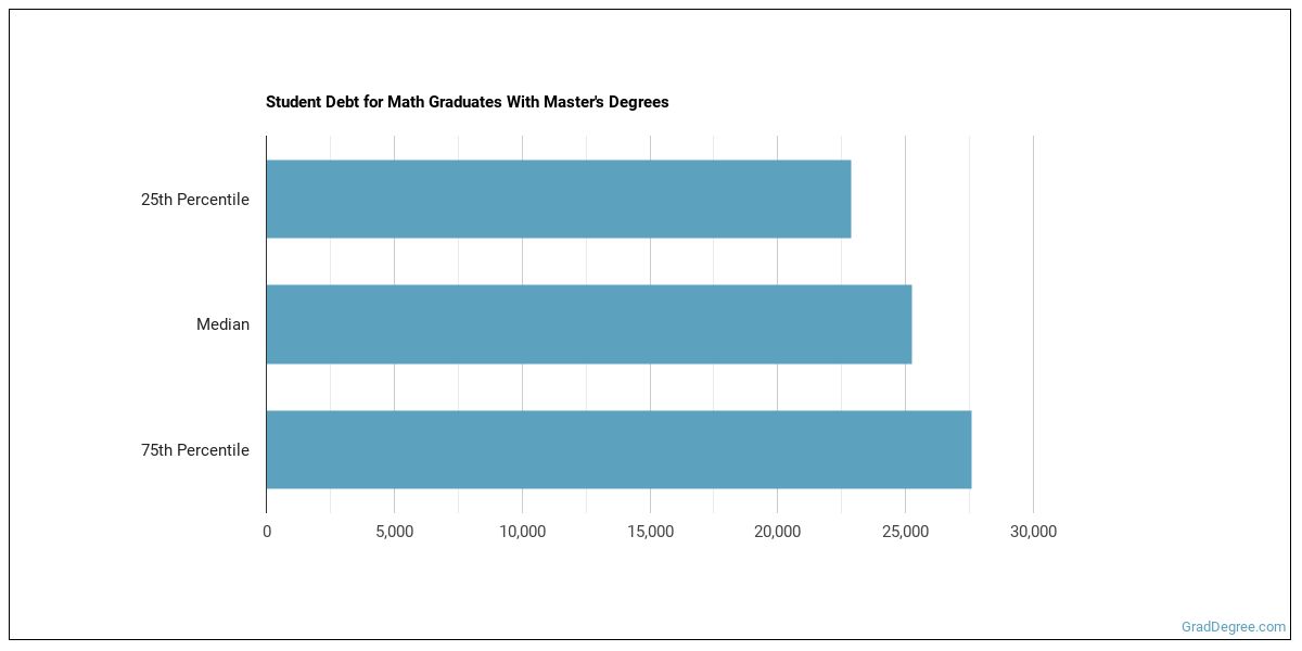 The median student debt for graduates holding a master's degree in math is $24,958. The length of time it takes you to graduate and what college you attend can affect this number quite a bit. The chart below shows the range of accumulated debt loads. On the high side of the range, $24,958 is the debt load, and the debt load on the low side is $24,958.