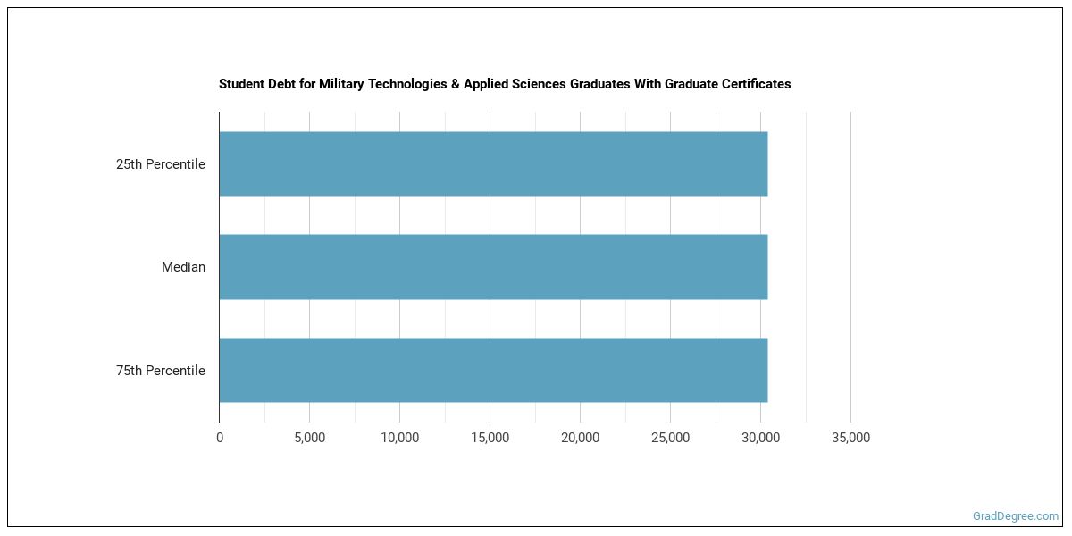 The median student debt for graduates holding a graduate certificate in military technologies & applied sciences is $38,744. The school you go to and how long it takes you to graduate, among other things, can cause this number to vary. The chart below shows the range of accumulated debt loads. On the high side of the range, $38,744 is the debt load, and the debt load on the low side is $38,744.