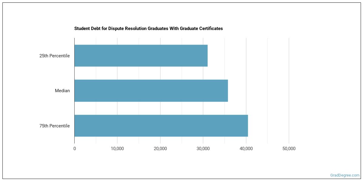 The median student debt for graduates holding a graduate certificate in dispute resolution is $56,326. The school you go to and how long it takes you to graduate, among other things, can cause this number to vary. The chart below shows the range of accumulated debt loads. On the high side of the range, $56,326 is the debt load, and the debt load on the low side is $56,326.