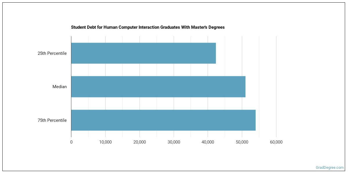 The median student debt for graduates holding a master's degree in human computer interaction is $54,689. The school you go to and how long it takes you to graduate, among other things, can cause this number to vary. The chart below shows the range of accumulated debt loads. On the high side of the range, $59,708 is the debt load, and the debt load on the low side is $39,267.