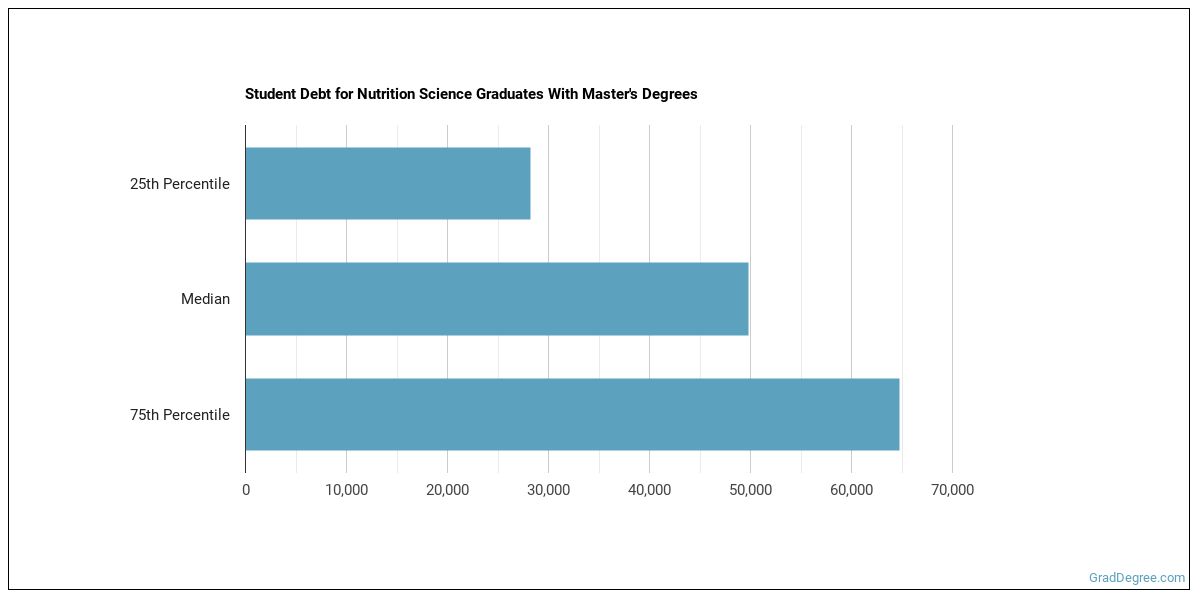 The median student debt for graduates holding a master's degree in nutrition science is $43,903. The school you go to and how long it takes you to graduate, among other things, can cause this number to vary. The chart below shows the range of accumulated debt loads. On the high side of the range, $66,250 is the debt load, and the debt load on the low side is $27,770.