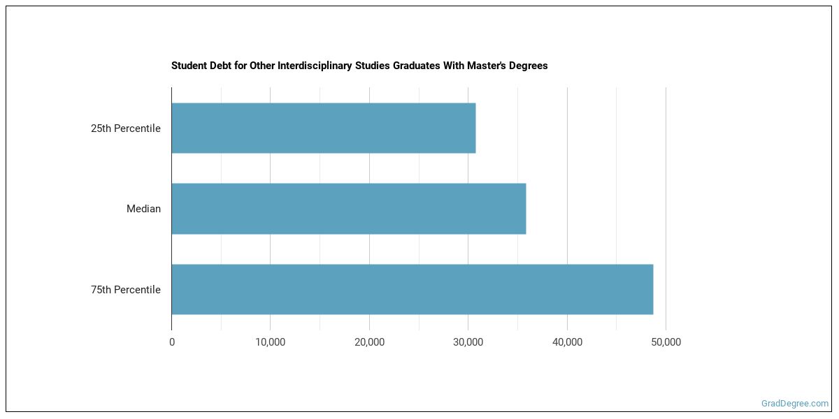 The median student debt for graduates holding a master's degree in other interdisciplinary studies is $40,730. The school you go to and how long it takes you to graduate, among other things, can cause this number to vary. The chart below shows the range of accumulated debt loads. On the high side of the range, $50,763 is the debt load, and the debt load on the low side is $34,309.