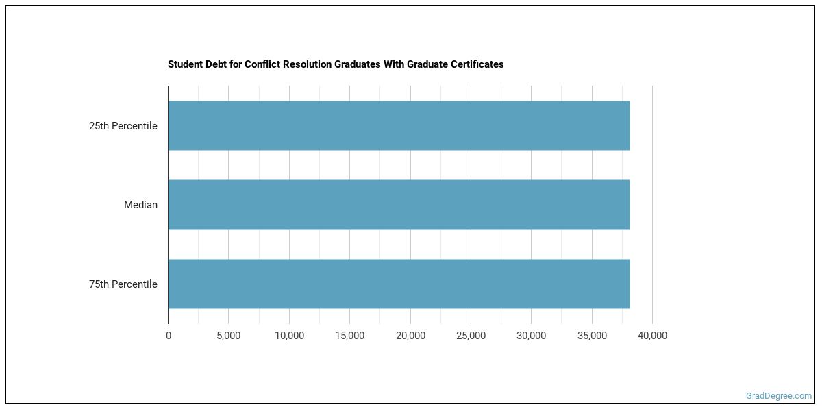 The median student debt for graduates holding a graduate certificate in conflict resolution is $33,823. The school you go to and how long it takes you to graduate, among other things, can cause this number to vary. The chart below shows the range of accumulated debt loads. On the high side of the range, $33,823 is the debt load, and the debt load on the low side is $33,823.