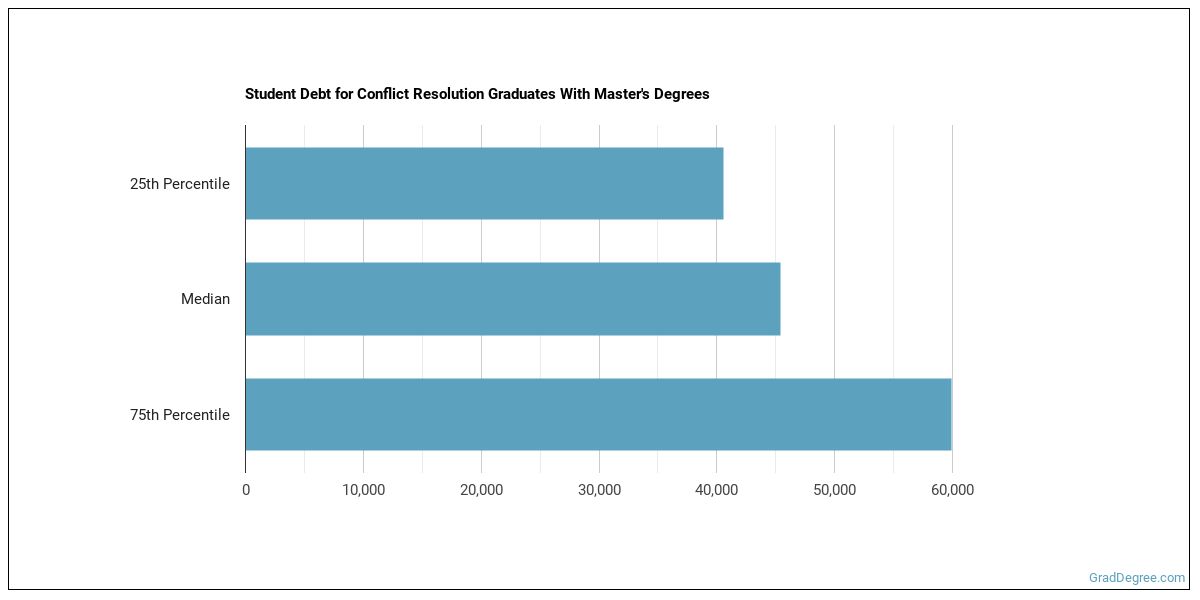 The median student debt for graduates holding a master's degree in conflict resolution is $42,959. The length of time it takes you to graduate and what college you attend can affect this number quite a bit. The chart below shows the range of accumulated debt loads. On the high side of the range, $60,293 is the debt load, and the debt load on the low side is $39,963.