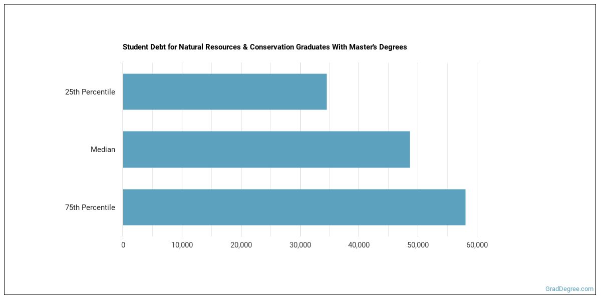 The median student debt for graduates holding a master's degree in natural resources & conservation is $37,989. The school you go to and how long it takes you to graduate, among other things, can cause this number to vary. The chart below shows the range of accumulated debt loads. On the high side of the range, $41,000 is the debt load, and the debt load on the low side is $28,084.