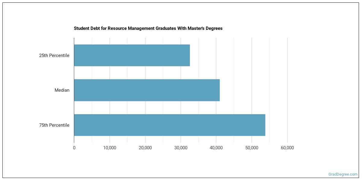 The median student debt for graduates holding a master's degree in resource management is $34,582. The length of time it takes you to graduate and what college you attend can affect this number quite a bit. The chart below shows the range of accumulated debt loads. On the high side of the range, $40,481 is the debt load, and the debt load on the low side is $23,628.