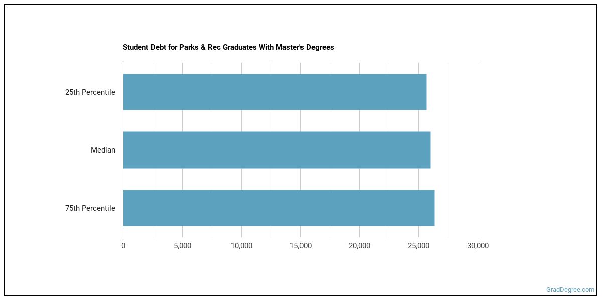 The median student debt for graduates holding a master's degree in parks & rec is $30,099. The school you go to and how long it takes you to graduate, among other things, can cause this number to vary. The chart below shows the range of accumulated debt loads. On the high side of the range, $30,099 is the debt load, and the debt load on the low side is $30,099.