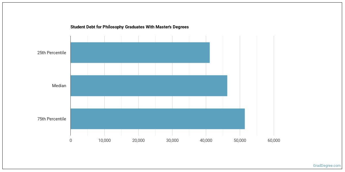 The median student debt for graduates holding a master's degree in philosophy is $42,373. The length of time it takes you to graduate and what college you attend can affect this number quite a bit. The chart below shows the range of accumulated debt loads. On the high side of the range, $42,373 is the debt load, and the debt load on the low side is $42,373.