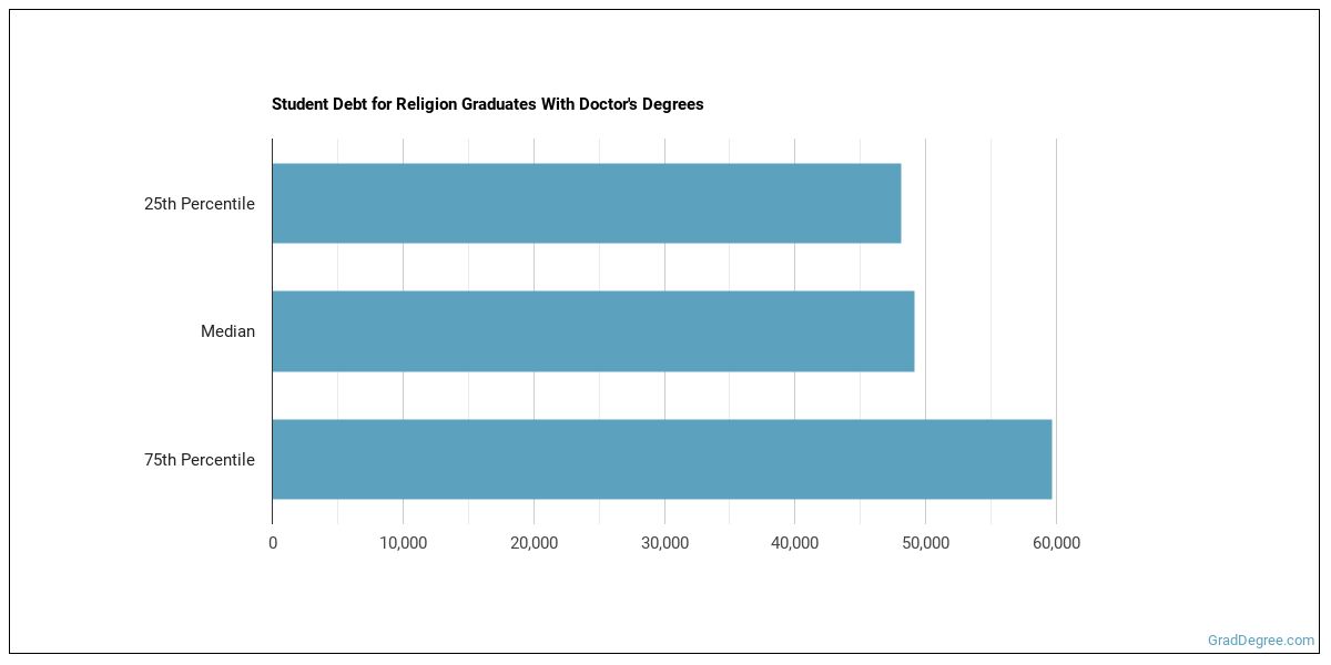 The median student debt for graduates holding a doctor's degree in religion is $126,032. The school you go to and how long it takes you to graduate, among other things, can cause this number to vary. The chart below shows the range of accumulated debt loads. On the high side of the range, $157,688 is the debt load, and the debt load on the low side is $94,375.