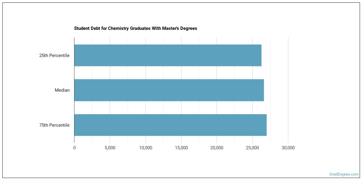 The median student debt for graduates holding a master's degree in chemistry is $25,475. The school you go to and how long it takes you to graduate, among other things, can cause this number to vary. The chart below shows the range of accumulated debt loads. On the high side of the range, $26,035 is the debt load, and the debt load on the low side is $24,915.