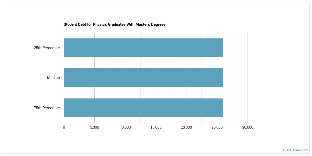 The median student debt for graduates holding a master's degree in physics is $118,813. The length of time it takes you to graduate and what college you attend can affect this number quite a bit. The chart below shows the range of accumulated debt loads. On the high side of the range, $118,813 is the debt load, and the debt load on the low side is $118,813.