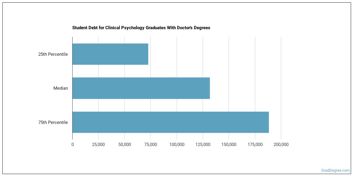The median student debt for graduates holding a doctor's degree in clinical psychology is $131,500. The school you go to and how long it takes you to graduate, among other things, can cause this number to vary. The chart below shows the range of accumulated debt loads. On the high side of the range, $181,467 is the debt load, and the debt load on the low side is $83,264.