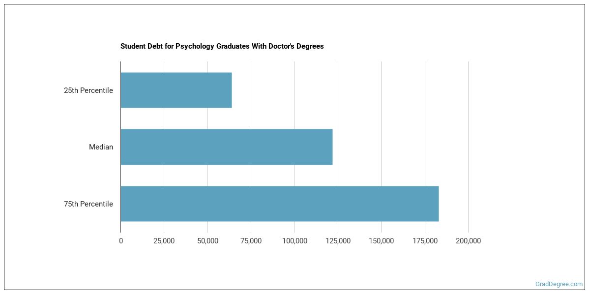 The median student debt for graduates holding a doctor's degree in psychology is $131,500. The school you go to and how long it takes you to graduate, among other things, can cause this number to vary. The chart below shows the range of accumulated debt loads. On the high side of the range, $181,467 is the debt load, and the debt load on the low side is $81,707.