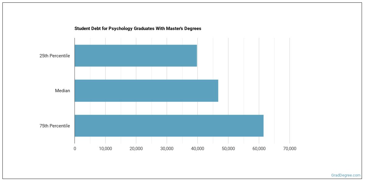 The median student debt for graduates holding a master's degree in psychology is $43,255. The school you go to and how long it takes you to graduate, among other things, can cause this number to vary. The chart below shows the range of accumulated debt loads. On the high side of the range, $58,291 is the debt load, and the debt load on the low side is $36,601.