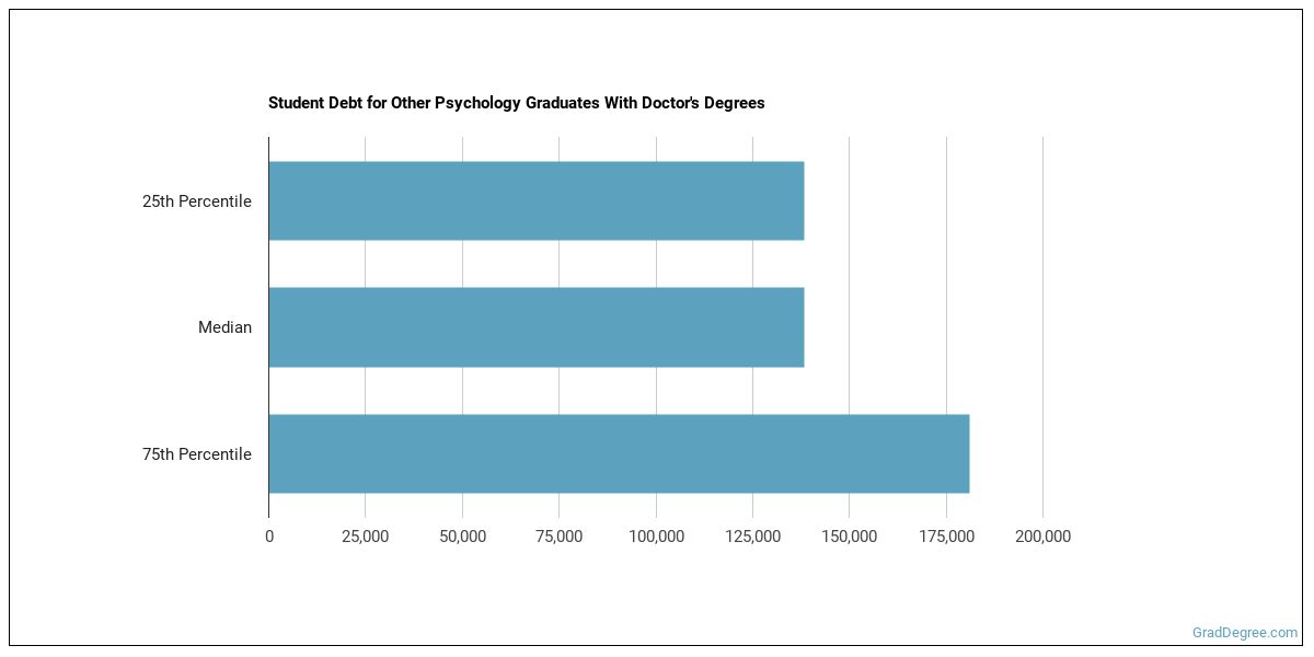The median student debt for graduates holding a doctor's degree in other psychology is $158,875. The length of time it takes you to graduate and what college you attend can affect this number quite a bit. The chart below shows the range of accumulated debt loads. On the high side of the range, $183,866 is the debt load, and the debt load on the low side is $158,875.