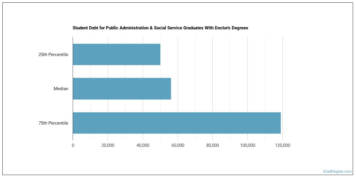 The median student debt for graduates holding a doctor's degree in public administration & social service is $91,930. The school you go to and how long it takes you to graduate, among other things, can cause this number to vary. The chart below shows the range of accumulated debt loads. On the high side of the range, $116,557 is the debt load, and the debt load on the low side is $55,825.