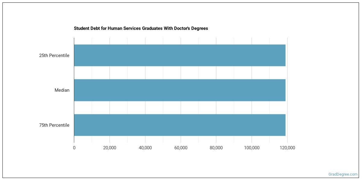 The median student debt for graduates holding a doctor's degree in human services is $122,527. The length of time it takes you to graduate and what college you attend can affect this number quite a bit. The chart below shows the range of accumulated debt loads. On the high side of the range, $136,413 is the debt load, and the debt load on the low side is $108,642.