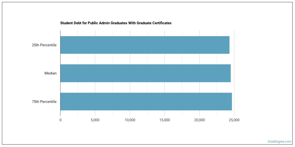 The median student debt for graduates holding a graduate certificate in public admin is $38,354. The length of time it takes you to graduate and what college you attend can affect this number quite a bit. The chart below shows the range of accumulated debt loads. On the high side of the range, $44,588 is the debt load, and the debt load on the low side is $32,120.