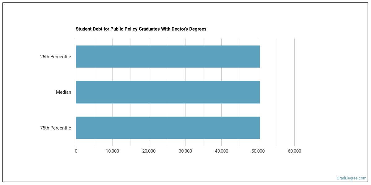 The median student debt for graduates holding a doctor's degree in public policy is $55,475. The school you go to and how long it takes you to graduate, among other things, can cause this number to vary. The chart below shows the range of accumulated debt loads. On the high side of the range, $55,475 is the debt load, and the debt load on the low side is $55,475.