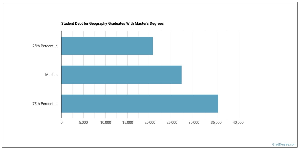 The median student debt for graduates holding a master's degree in geography is $33,037. The school you go to and how long it takes you to graduate, among other things, can cause this number to vary. The chart below shows the range of accumulated debt loads. On the high side of the range, $36,430 is the debt load, and the debt load on the low side is $28,755.