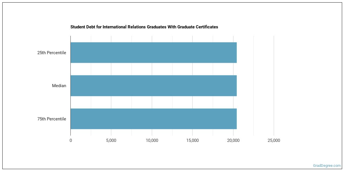 The median student debt for graduates holding a graduate certificate in international relations is $20,500. The length of time it takes you to graduate and what college you attend can affect this number quite a bit. The chart below shows the range of accumulated debt loads. On the high side of the range, $20,500 is the debt load, and the debt load on the low side is $20,500.