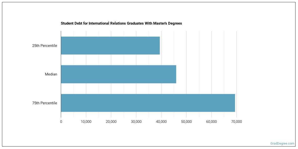 The median student debt for graduates holding a master's degree in international relations is $42,940. The length of time it takes you to graduate and what college you attend can affect this number quite a bit. The chart below shows the range of accumulated debt loads. On the high side of the range, $60,843 is the debt load, and the debt load on the low side is $37,167.