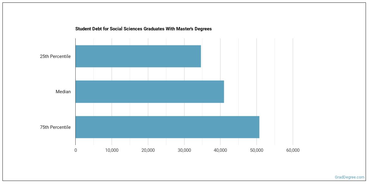 The median student debt for graduates holding a master's degree in social sciences is $39,630. The school you go to and how long it takes you to graduate, among other things, can cause this number to vary. The chart below shows the range of accumulated debt loads. On the high side of the range, $48,671 is the debt load, and the debt load on the low side is $30,750.
