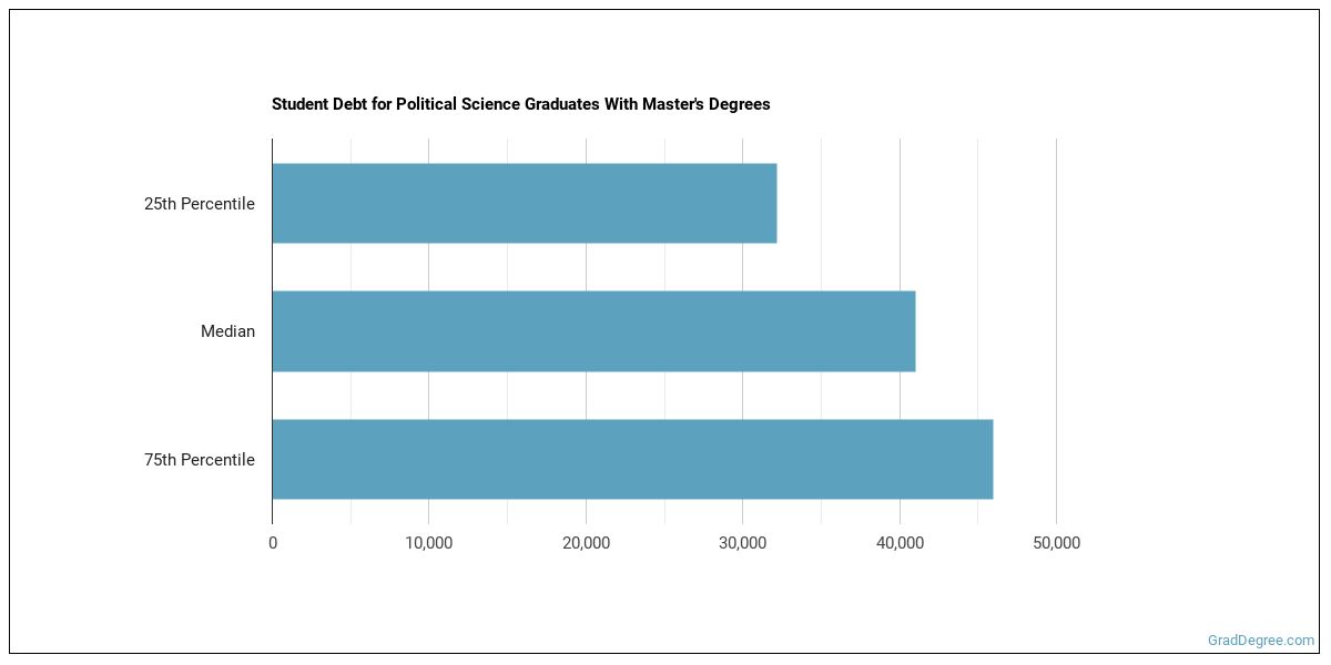 The median student debt for graduates holding a master's degree in political science is $39,051. The length of time it takes you to graduate and what college you attend can affect this number quite a bit. The chart below shows the range of accumulated debt loads. On the high side of the range, $50,619 is the debt load, and the debt load on the low side is $34,221.