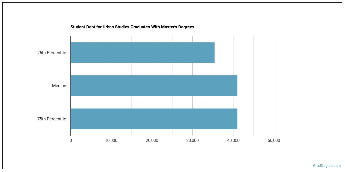 The median student debt for graduates holding a master's degree in urban studies is $32,496. The length of time it takes you to graduate and what college you attend can affect this number quite a bit. The chart below shows the range of accumulated debt loads. On the high side of the range, $37,305 is the debt load, and the debt load on the low side is $28,637.