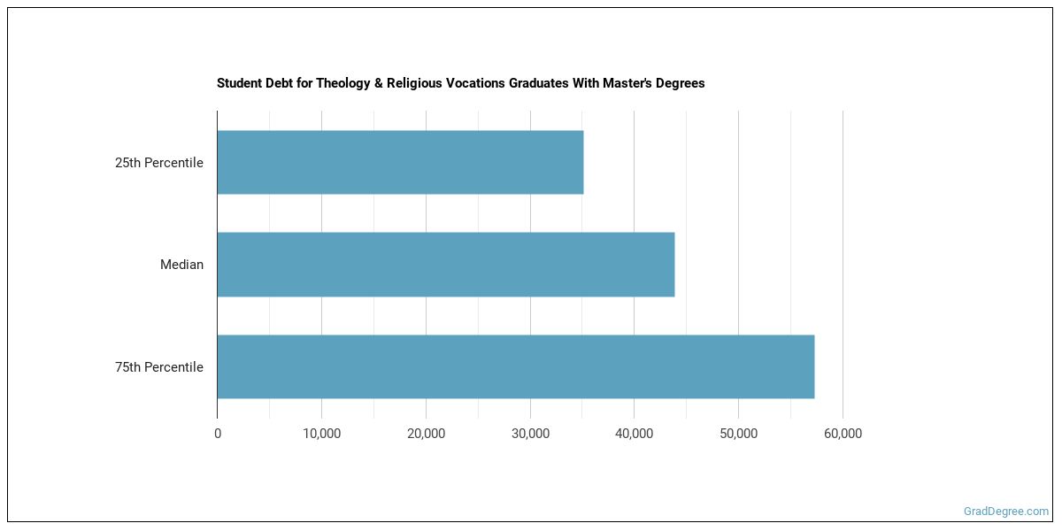 The median student debt for graduates holding a master's degree in theology & religious vocations is $41,000. The length of time it takes you to graduate and what college you attend can affect this number quite a bit. The chart below shows the range of accumulated debt loads. On the high side of the range, $54,344 is the debt load, and the debt load on the low side is $32,882.