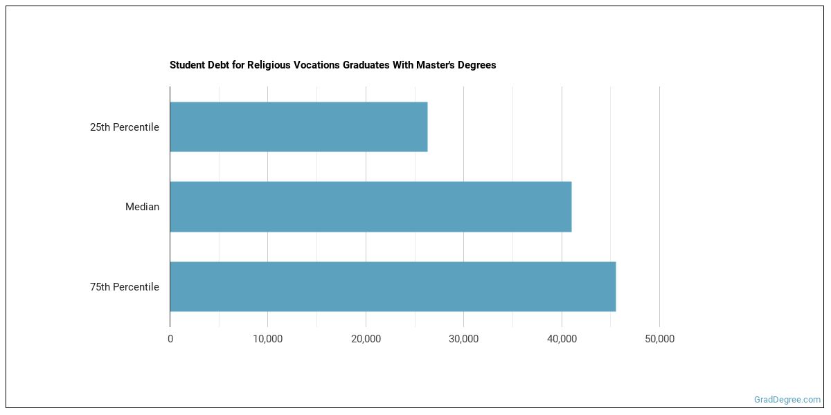 The median student debt for graduates holding a master's degree in religious vocations is $37,697. The length of time it takes you to graduate and what college you attend can affect this number quite a bit. The chart below shows the range of accumulated debt loads. On the high side of the range, $45,007 is the debt load, and the debt load on the low side is $37,697.
