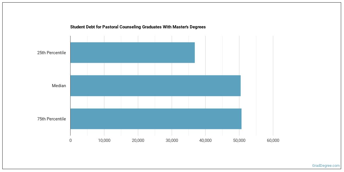 The median student debt for graduates holding a master's degree in pastoral counseling is $42,942. The length of time it takes you to graduate and what college you attend can affect this number quite a bit. The chart below shows the range of accumulated debt loads. On the high side of the range, $46,476 is the debt load, and the debt load on the low side is $37,272.