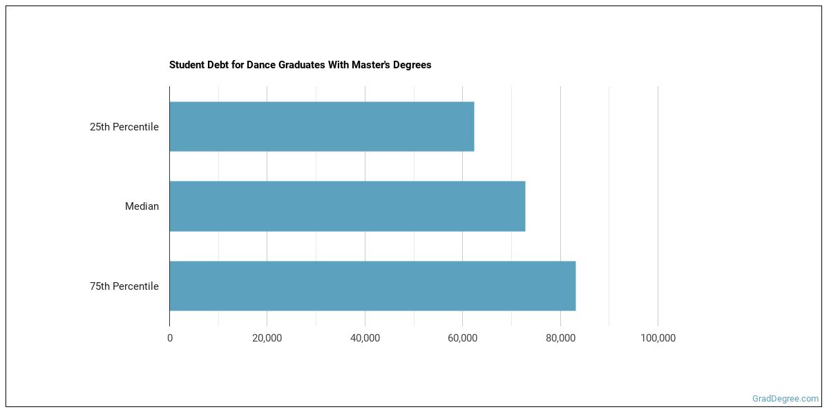 The median student debt for graduates holding a master's degree in dance is $74,187. The length of time it takes you to graduate and what college you attend can affect this number quite a bit. The chart below shows the range of accumulated debt loads. On the high side of the range, $90,781 is the debt load, and the debt load on the low side is $57,594.