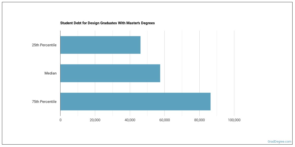 The median student debt for graduates holding a master's degree in design is $61,975. The school you go to and how long it takes you to graduate, among other things, can cause this number to vary. The chart below shows the range of accumulated debt loads. On the high side of the range, $80,930 is the debt load, and the debt load on the low side is $40,705.