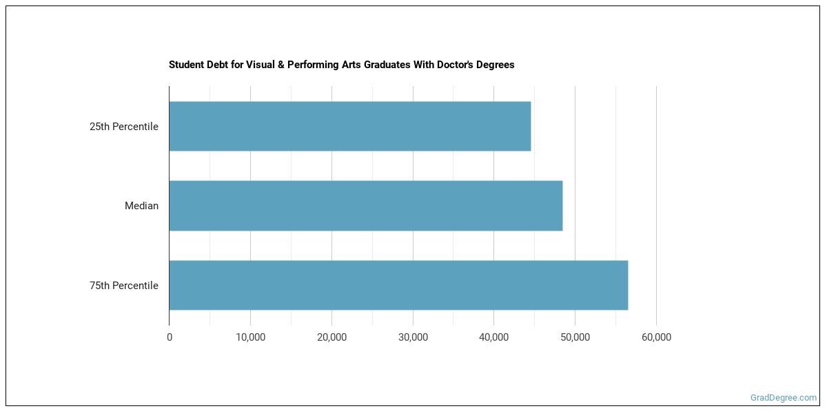 The median student debt for graduates holding a doctor's degree in visual & performing arts is $56,466. The length of time it takes you to graduate and what college you attend can affect this number quite a bit. The chart below shows the range of accumulated debt loads. On the high side of the range, $63,066 is the debt load, and the debt load on the low side is $40,650.