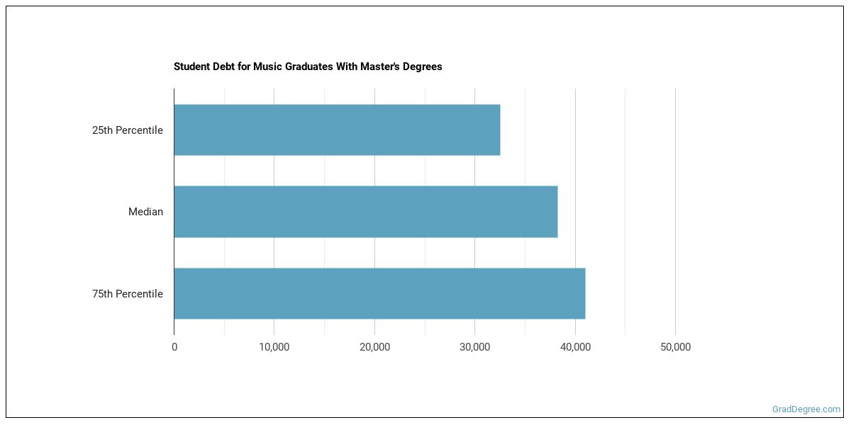 The median student debt for graduates holding a master's degree in music is $39,925. The school you go to and how long it takes you to graduate, among other things, can cause this number to vary. The chart below shows the range of accumulated debt loads. On the high side of the range, $41,000 is the debt load, and the debt load on the low side is $33,446.