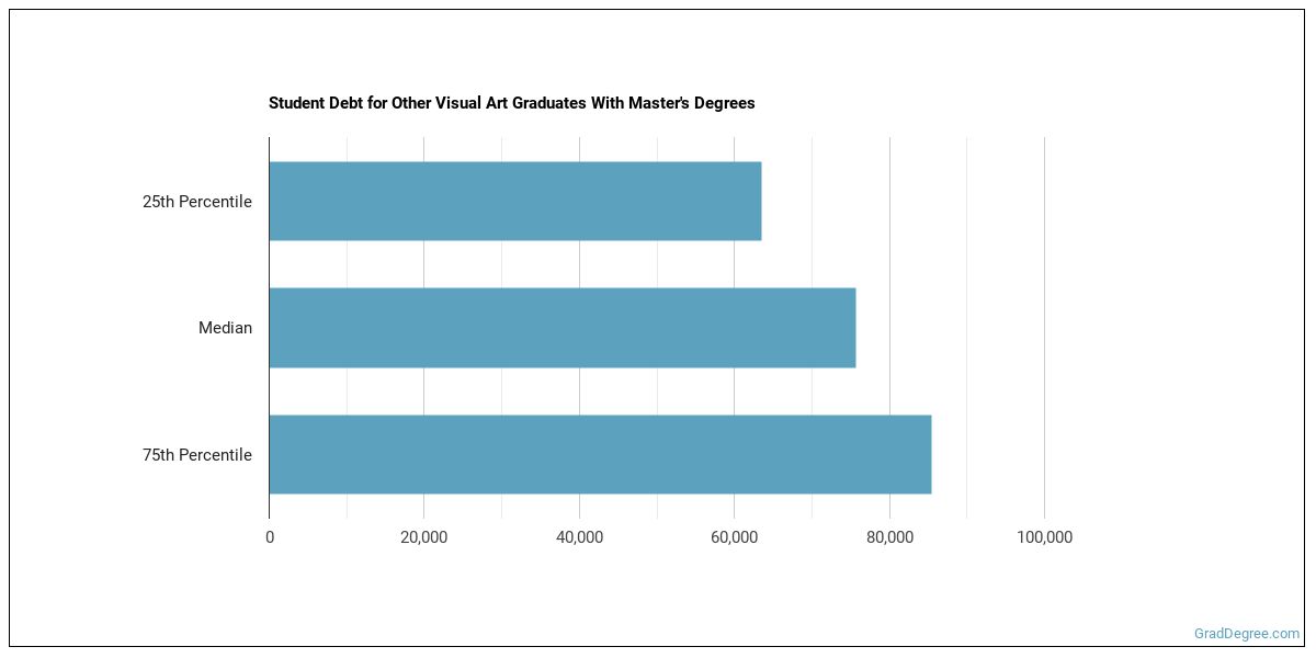 The median student debt for graduates holding a master's degree in other visual art is $69,769. The length of time it takes you to graduate and what college you attend can affect this number quite a bit. The chart below shows the range of accumulated debt loads. On the high side of the range, $78,889 is the debt load, and the debt load on the low side is $60,649.